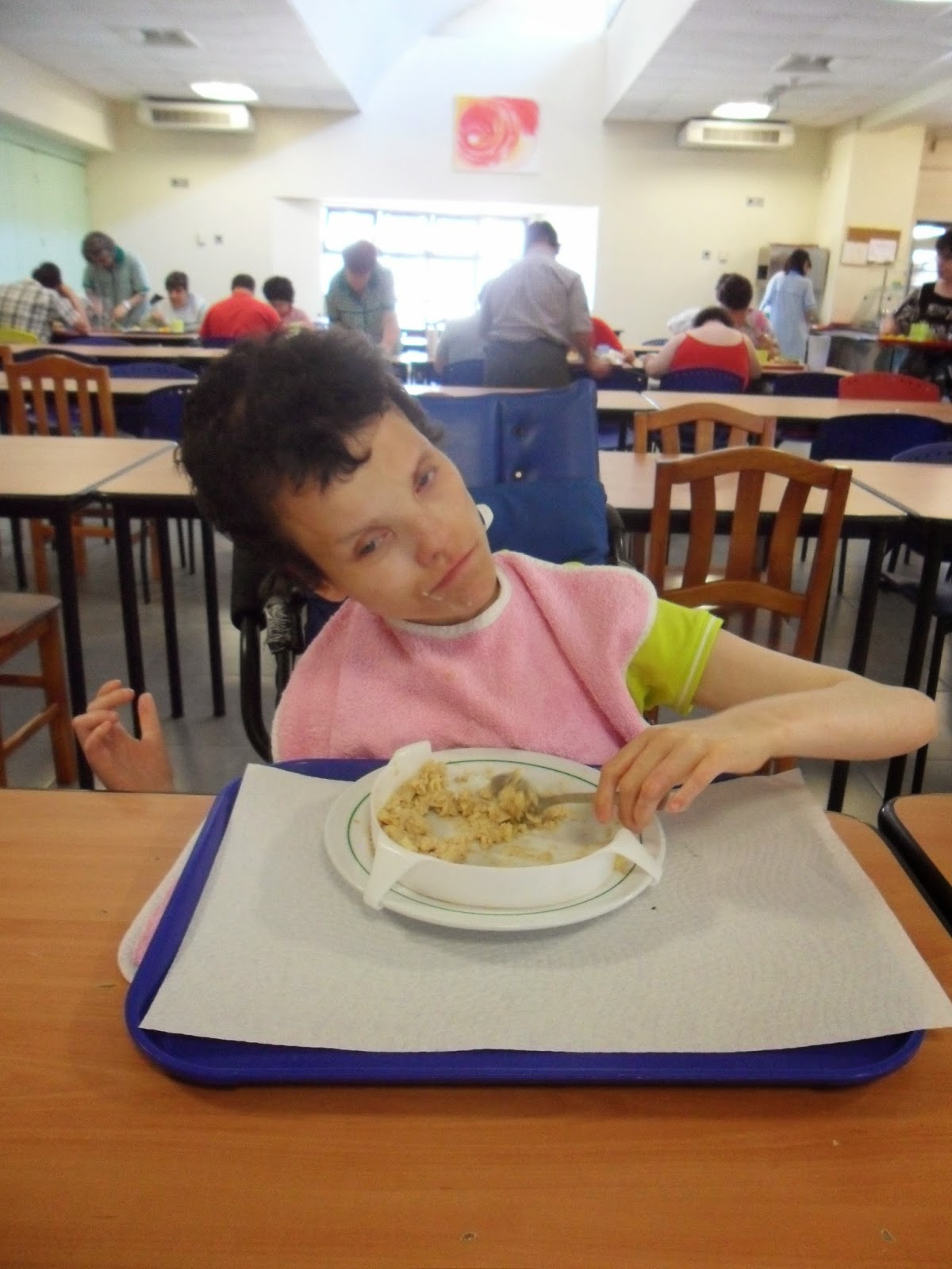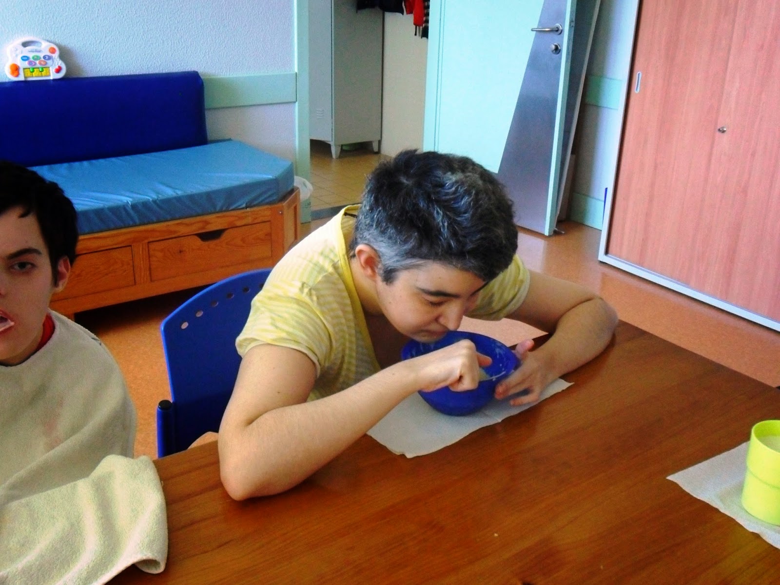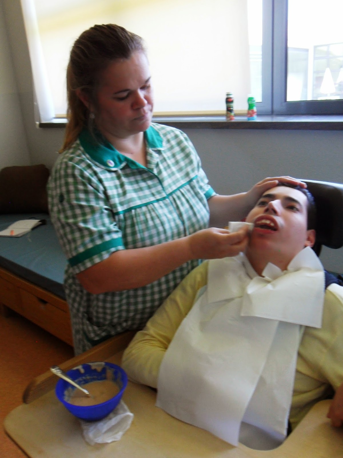 A hora de almoço e a hora do lanche destes utentes acarretam sempre uma enorme e meticulosa preparação prévia por parte das responsáveis desta sala que têm que cortar a comida em pequenos pedaços ou pedir às cozinheiras que passem totalmente a comida para que o Simão, a Paula, a Isabel e o Tiago a possam comer sem correrem o risco de se engasgarem tanto.